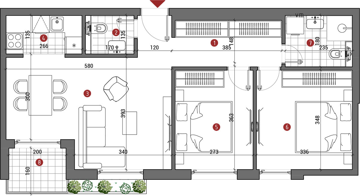Stan 04 Trosoban stan Vojvode Prijezde 8-10 Kvadratura stana 64.37 Broj soba 3 Sprat Pr. Osnova stana Prostorije 01. Hodnik 7.98 m2 02. Toalet 2.29 m2 03. Dnevna soba sa trpezarijom 20.27 m2 04. Kuhinja 3.77 m2 05. Spavaća soba 9.49 m2 06. Spavaća soba 11.68 m2 07. Kupatilo 4.23 m2 08. Terasa 4.66 m2 Ukupno stan 64.37 m2 Orijentacija stana u prostoru 3D prikaz stana